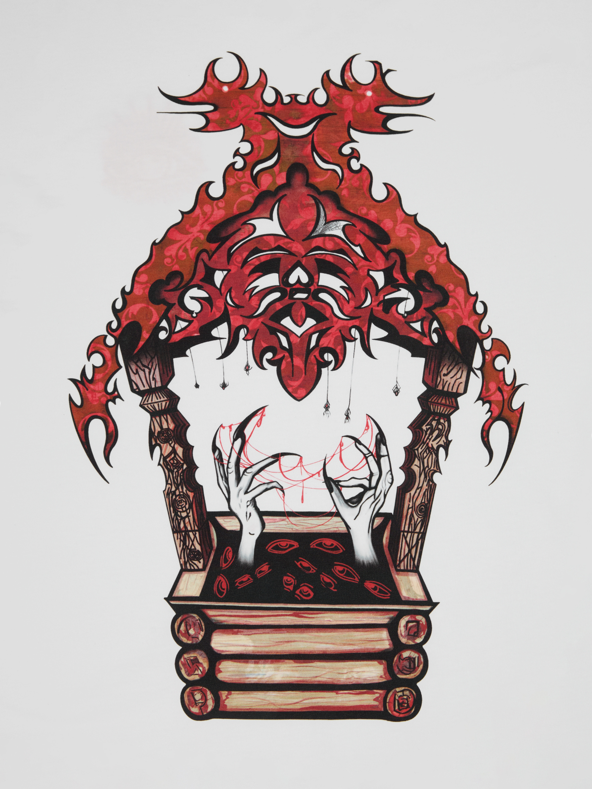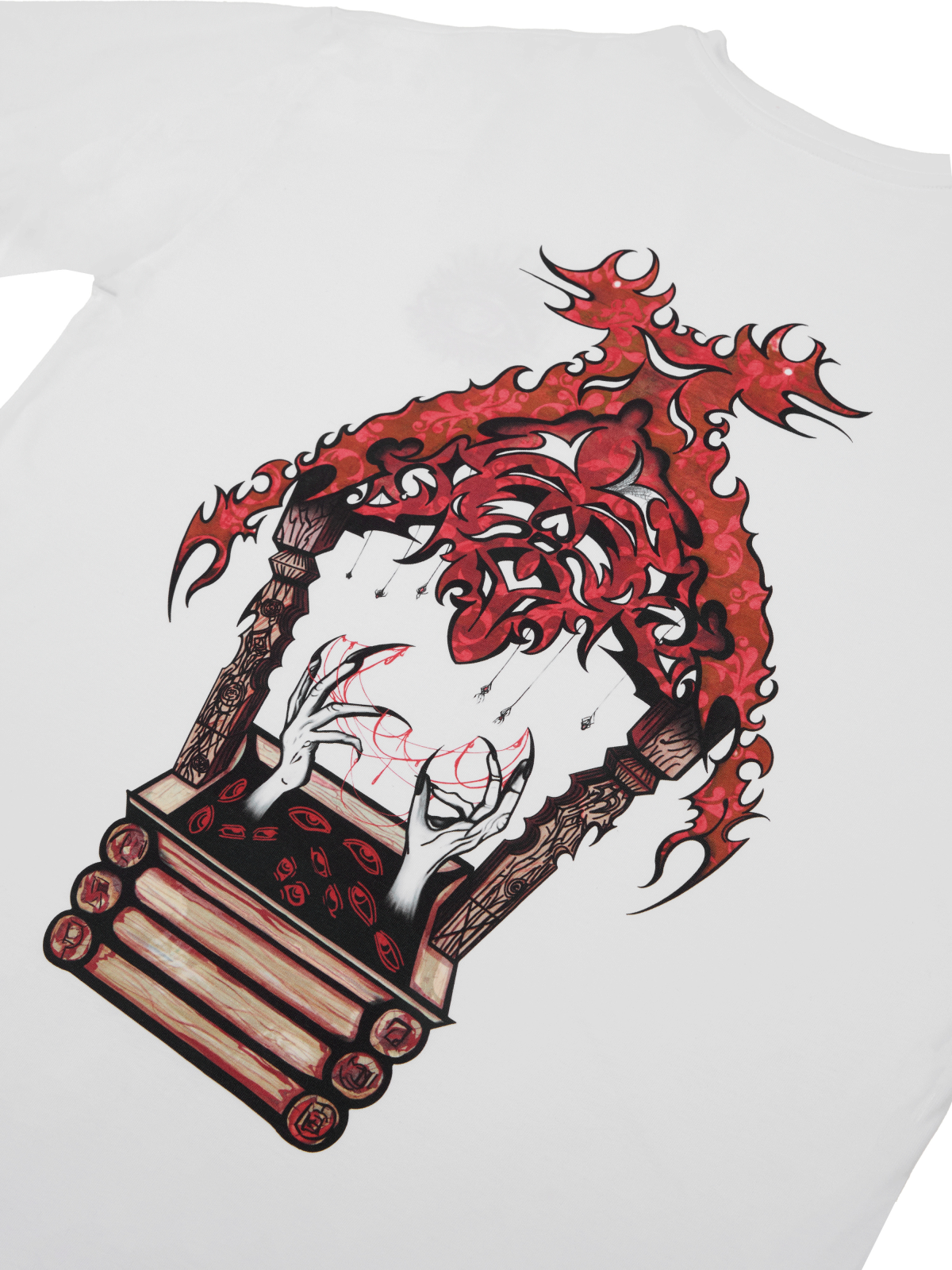 The cut is oversized, but thoughtful. The shoulder seam is set so the t-shirt sits freely, but not baggy. The eye embroidery on the chest is textured, handmade by the same craftsmen who work on the sweatshirts. The print on the back is applied using screen printing — durable, doesn't crack, doesn't fade.